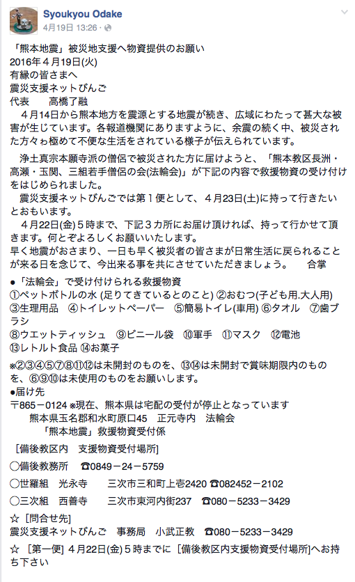 一般にはなかなか伝わっていませんが、東日本大震災以降、多くの宗教者が被災された方に対して何ができるかという問題に真摯に向き合い、今も活動しています。今回も私のFacebookのタイムラインには多くの活動報告が出てきています。(投稿日時が古いものもあります。何かサポートしたいという方、最新情報を確認いただくか、myogwanji@gmail.comまで連絡ください)